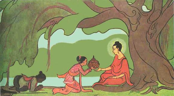He set out for the village of Uruvela, but before he had walked even half-way, his strength failed him, and unable to catch his breath, he collapsed. He lay unconscious for some time before a young girl from the village appeared. Thirteen-year-old Sujata had been sent by her mother to carry rice-milk, cakes and lotus seeds to offer to the forest gods. When she saw the monk lying unconscious on the road, barely breathing, she knelt down and placed a bowl of milk to his lips. She knew he was an ascetic who had fainted from weakness.
